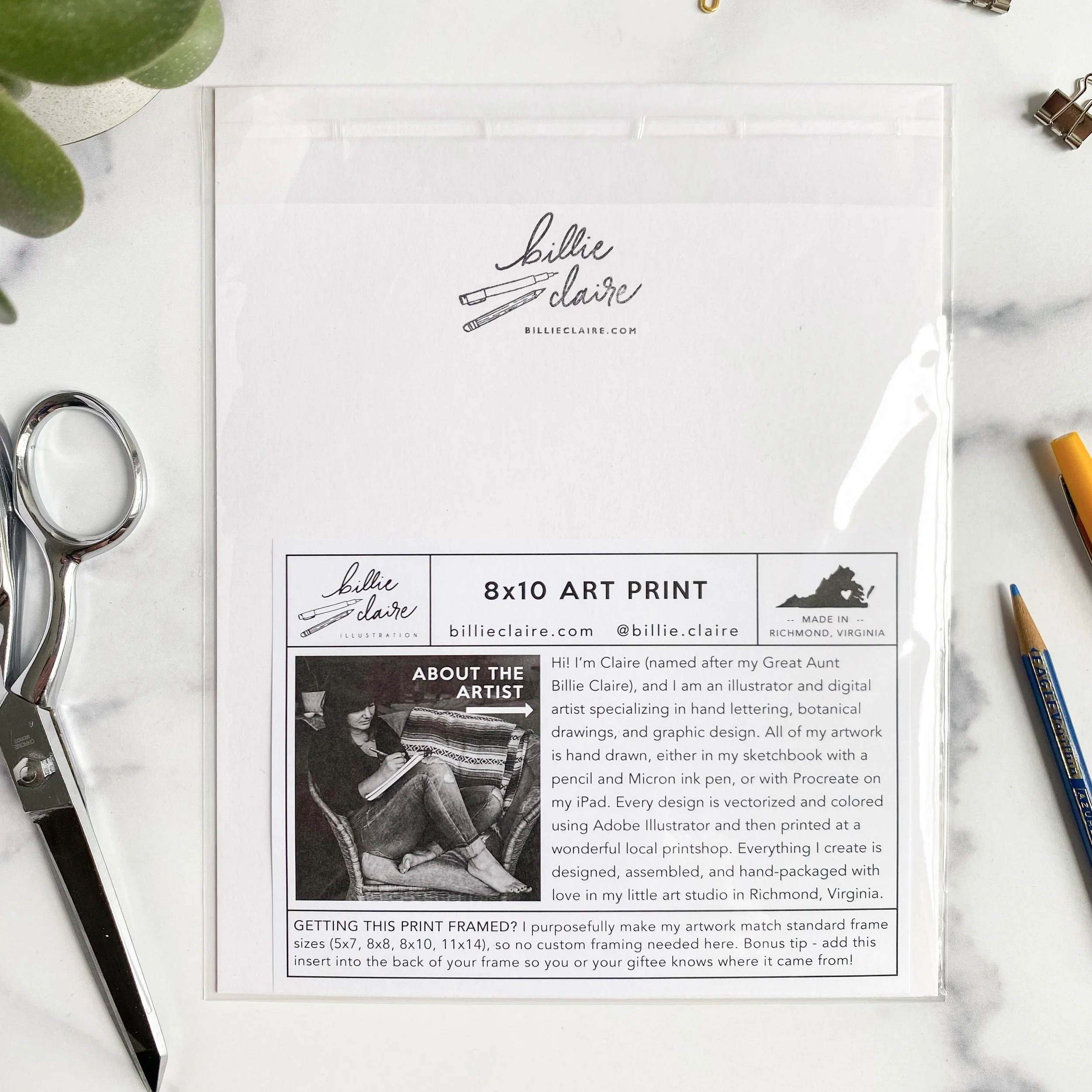 This original design was hand drawn with pencil and pen, and all Billie Claire products are printed in the US / designed and assembled in Richmond, Virginia. Copyright © 2021 Billie Claire Handmade