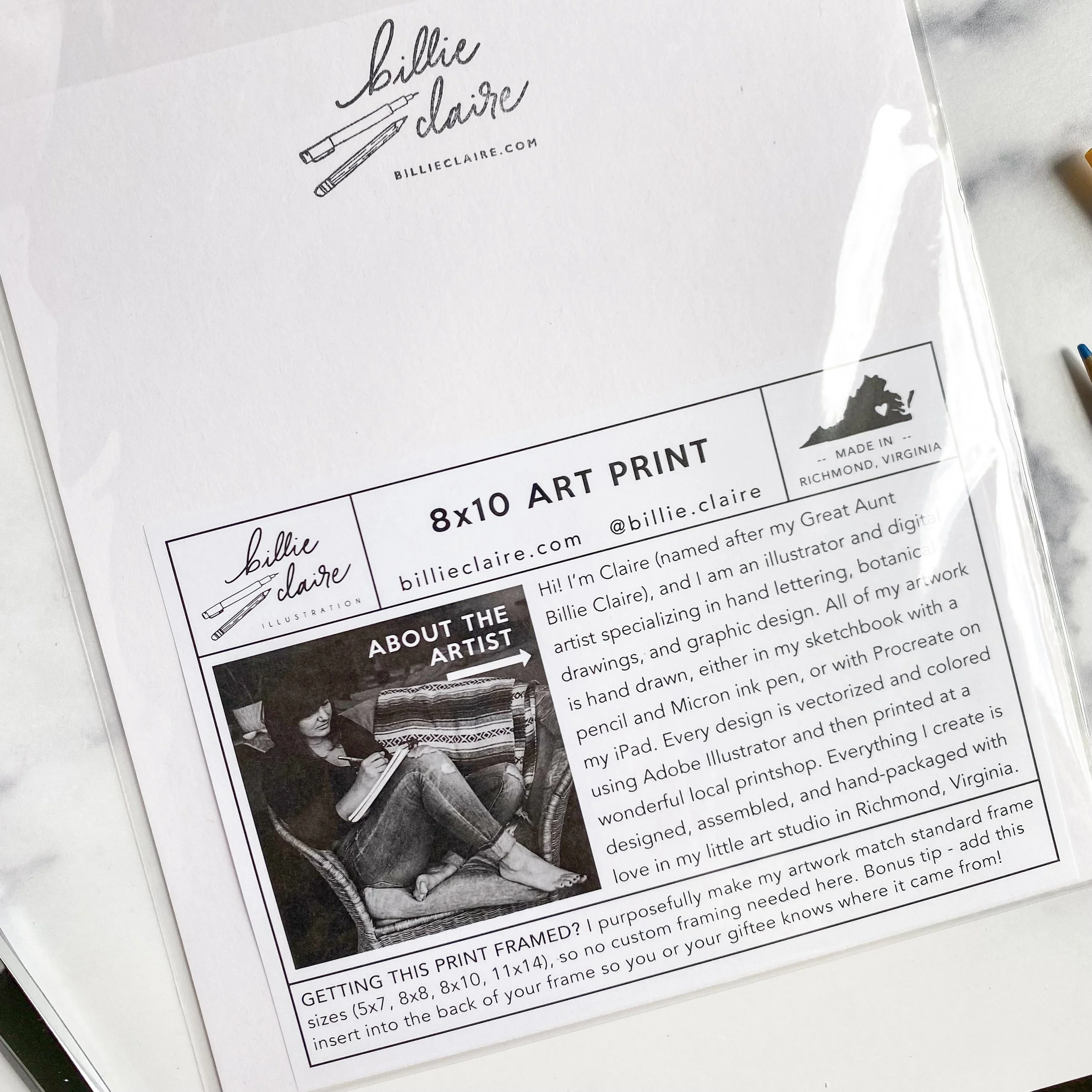 This original design was hand drawn with pencil and pen, and all Billie Claire products are printed in the US / designed and assembled in Richmond, Virginia. Copyright © 2021 Billie Claire Handmade