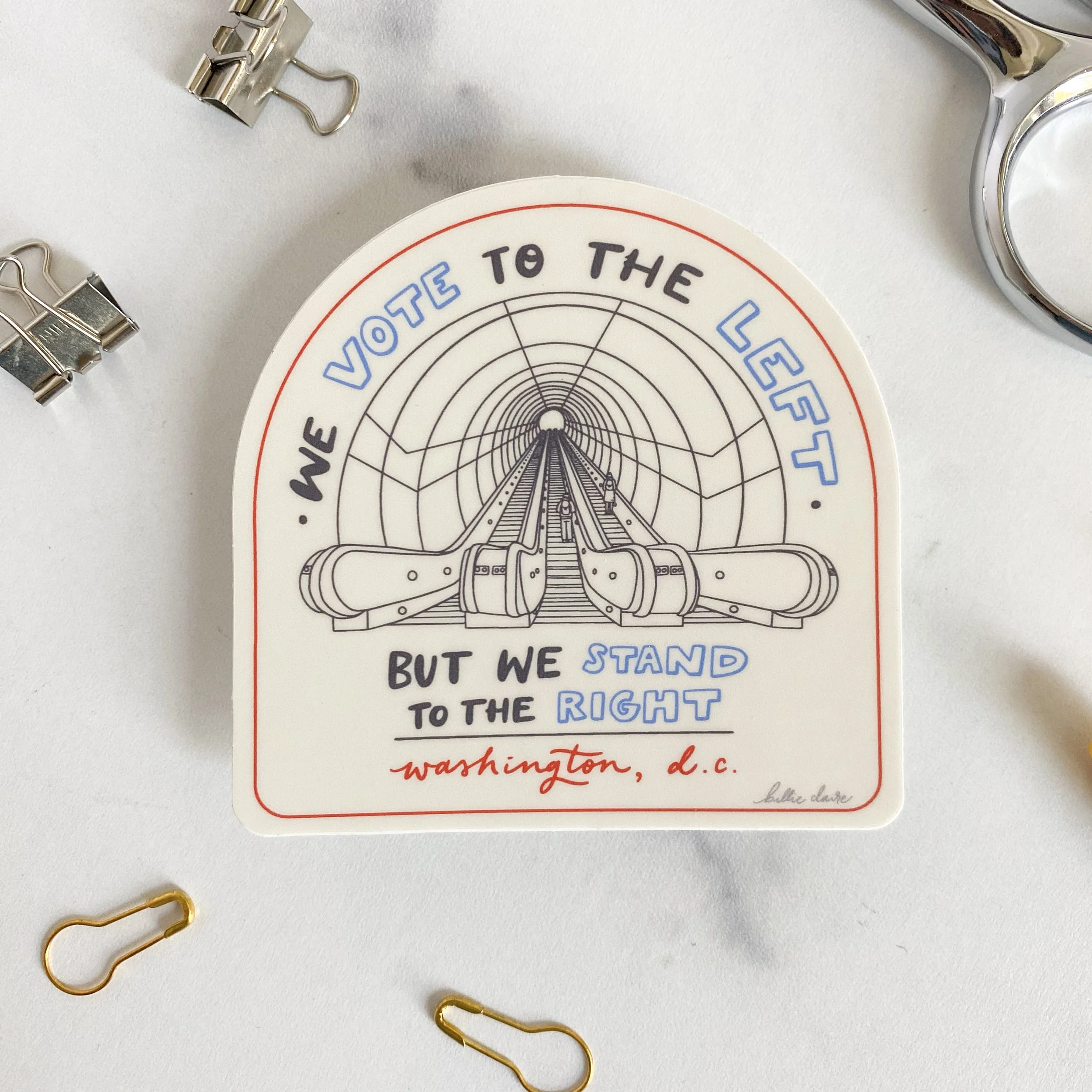 A red circle sticker with a hand drawn image of a Washington, DC metro car in the center, surrounded by text that reads: DC Metro - So Hot Right Now. A humorous play on how intensely warm the metro can be - in the winter, when you have sprinted down the escalator in a full coat and spring onto the metro before the doors close, and are then squeezed in a tight crowd of everyone else in full coats; you cannot get your scarf off fast enough. This sticker also rings true in the summer in DC, hot, muggy, and sweaty aren’t we all.
